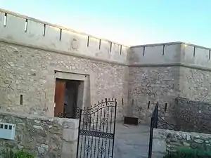 Castillo de las Escobetas ("Castle of the Nazarene") is located 3.25 miles (5.23 km) northward of Cantal Point,[1] in the town of Garrucha, Almería province, in the autonomous community of Andalusia, Spain. The fishing village of Garrucha suffered at the hands of Berber pirates until the year 1766 when barracks were built at Escobetas, a provisional military building which cost 13,970 reais. In 1769, the castle was completed at a cost of 181,000 reais. The fort was designed by the architect Francisco Ruiz Garrido. After its construction, Garrucha began to grow. It is of masonry construction in three section. The central portion is rectangular with rounded short sides. Attached to the right lateral side, there is a truncated pyramid shape with sloping walls. In its upper part, a parapet is pierced with loopholes. The main body is attached to the left side, of lower height, without openings. It is accessed by an external staircase and one tranche that attaches to the right side. In 1963, the Ministry of Culture declared the site a Bien de Interés Cultural monument.