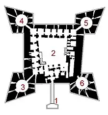 Access to the castle is mediated by the presence of the ravelin and the subsequent bridge over the moat.[90] Until the 18th century, the ravelin was part of a larger defense system that, through winding paths, led to the widening in front of the guardhouse.[91] This is divided into two lateral compartments from the central atrium, each having a hole in the wall opposite the entrance, while the roof is enclosed by tuff masonry provided with embrasures, except on the side facing the bridge where the parapet is lower to allow military maneuvers with the interior. During restoration work in the 1980s, the presence of a staircase was revealed to have led from the west compartment onto the structure's terrace.[92] However, the staircase that was found was not made usable because the ravelin lacks an exit to the terrace, so arrival on the solar slab can only be from the masonry deck through the use of an external staircase.