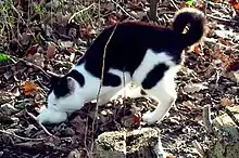 Object play for cats is the use of inanimate objects by the animal to express play behaviour.[3] In the case of pet domestic cats, humans normally provide them with purchased, human-made toys such as toy mice, bird or feather toys, or toy insects. These may be suspended from a string attached to a wooden or fishing-style rod designed to simulate lifelike activity in the toy, triggering the cat's predatory instincts – this game is known as catfishing.[4] Cat play can be enriched with the addition of obstacles behind which the prey can hide and items that make sound when the toy moves through them such as dried leaves, grass, or even a paper bag. When it comes to non-domestic, wild cats, they may use several objects in the wilderness as their toys including sticks, leaves, rocks, feathers, etc. Play behaviour includes throwing, chasing, biting, and capturing the toy object, mimicking behaviors used during an interaction with a real source of prey. Engaging in object play helps young cats practice these adult skills.[3]