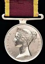 Recipients of this medal who also qualified for the Second China War Medal in 1861 received a clasp inscribed China 1842 to add to their existing medal,[5] in addition to any clasps relating to the second war to which they were entitled. Although these clasps were intended to be fixed to the earlier medal, the different width and style of the two suspenders meant that it was not clear how this was to be done. As a result, the clasps were often simply slipped over the ribbon which was sometimes replaced with the narrower 32mm type supplied with the second medal. Other recipients of the earlier medal replaced the original suspender with one similar to that found on the second medal.[3]