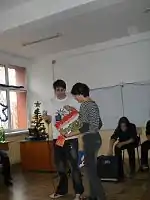At the beginning of December, the Christmas lights are turned on all over the streets. The same night, Moş Nicolae comes and gives children presents.[11] Children receive their gifts early in the morning of December 6 or late at night on December 5; traditionally, the gifts are put in their laced up boots.[12] Children are usually given sweets or books; if they have been naughty, they get wooden sticks.[12]