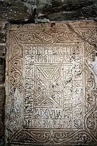 Funerary inscription: "In the name of the Lord. This stone is placed at the head of the body and it reads: Here rests the servant of God Arogontine confessed, and died on Wednesday, September 1 for the year 1003.[1]