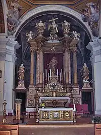 The three-naved interior was redecorated in Baroque style during the period 1721-1729. The presbytery was rebuilt by the bishop Luca Cibo. He also probably added the cupola around 1490. The main altar stands before a construction with five winged angels on top of the gilded columns. The three statues behind the altar represent the Grieving Madonna flanked by the apostles James the Great and James the Less and were sculpted by Antonio Calcioni in 1702.