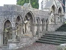 The Via Crucis (Way of the Cross) is unique and stone-sculptured.[14] It was added in the 1860s, when several buildings were demolished to make way for it.[15] The carvings by James Forsyth depict seven scenes from the Stations of the Cross.[16] The first shows Christ being condemned by Pontius Pilate, while the second is Christ carrying his cross. The third sculpture illustrates Christ falling under his cross, supported by Simon of Cyrene. The next tableau is of Christ meeting his mother and then having his clothing removed. The final representations as you climb the steps towards the church are of Christ being nailed to the cross and then his death, which is displayed on the gable of the north porch.[10][17][18]