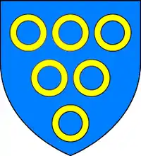 Arms of Musgrave of Musgrave, Hartley and Edenhall in Cumberland: Azure, six annulets three, two, one, or[13] These are the arms of Baron Musgrave created 1350, being a difference of the arms of Vipont, the powerful Westmorland family and overlords whose many feudal tenants and followers adopted for arms variants of Vipont