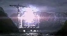 The decoding of the extraterrestrial message, with its architectural drawings of the machine, was created by Ken Ralston and Sony Pictures Imageworks. It was Zemeckis's and Ralston's sixth film collaboration. Imageworks created more than 350 visual effect shots, using a combination of model and miniature shots and digital graphics. On designing the Machine, Zemeckis said, "The Machine in Sagan's novel was somewhat vague, which is fine for a book. In a movie, though, if you're going to build a giant physical structure of alien design, you have to make it believable... It had to be huge, so that the audience would feel like it was bigger than man should be tinkering with. It had to look absolutely real."[8] The machine was then designed by concept artist Steve Burg, reusing a design he created as a "time-displacement device" for an unused scene in Terminator 2.[24]