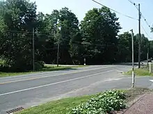 Past the reservoir, CR 513 splits from Route 31 and continues east on two-lane undivided West Main Street, entering residential areas. The road curves northeast and heads into High Bridge, where it turns north again. The route turns east onto Bridge Street and passes under New Jersey Transit’s Raritan Valley Line at the High Bridge station. After this, CR 513 makes a turn to the north onto Main Street and passes through the commercial downtown area. The route briefly heads east on Church Street before turning north onto Fairview Avenue and entering residential areas. The road heads into Lebanon Township and enters more mountainous and forested areas as it passes near Voorhees State Park. The route passes a mix of woods and homes as it intersects CR 628 and turns northeast, continuing through areas of farms, trees, and homes in a narrow valley. The roadway forms the border between Lebanon Township to the northwest and Califon to the southeast as it passes businesses and intersects the western terminus of CR 512. Past the CR 512 intersection, CR 513 fully enters Califon and continues past homes and commercial establishments. Upon entering Lebanon Township again, the road continues north through farmland and woodland with a few developments.[1][2]