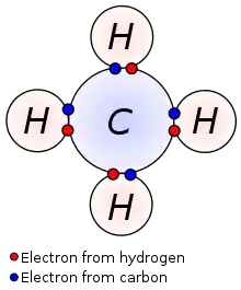 Lewis proposed that an atom forms enough covalent bonds to form a full (or closed) outer electron shell. In the diagram of methane shown here, the carbon atom has a valence of four and is, therefore, surrounded by eight electrons (the octet rule), four from the carbon itself and four from the hydrogens bonded to it. Each hydrogen has a valence of one and is surrounded by two electrons (a duet rule) – its own one electron plus one from the carbon. The numbers of electrons correspond to full shells in the quantum theory of the atom; the outer shell of a carbon atom is the n = 2 shell, which can hold eight electrons, whereas the outer (and only) shell of a hydrogen atom is the n = 1 shell, which can hold only two.[9]