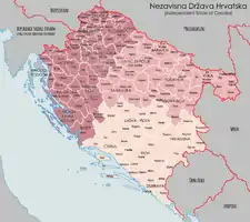 The Croatian Home Guard also included an air force, the Air Force of the Independent State of Croatia (Zrakoplovstvo Nezavisne Države Hrvatske, or ZNDH), the backbone of which was provided by 500 former Royal Yugoslav Air Force officers and 1,600 NCOs with 125 aircraft.[7] By 1943, the ZNDH was 9,775 strong and equipped with 295 aircraft.[8]