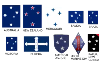 A stylized version of Crux appears on the Australian Eureka Flag. The constellation was also used on the dark blue, shield-like patch worn by personnel of the U.S. Army's Americal Division, which was organized in the Southern Hemisphere, on the island of New Caledonia, and also on the blue diamond of the U.S. 1st Marine Division, which fought on the Southern Hemisphere islands of Guadalcanal and New Britain.