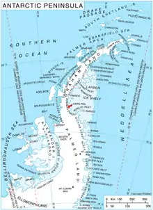 Curran Bluff (68°13′S 65°2′W / 68.217°S 65.033°W / -68.217; -65.033) is a bluff, 2 nautical miles (4 km) long, forming a part of the south coast of Joerg Peninsula, Bowman Coast, south of Reichle Mesa. The bluff rises to 910 metres (3,000 ft) at the west end and is the most prominent feature on the north side of Solberg Inlet. It was photographed from the air by Lincoln Ellsworth, 21 November 1935, and was mapped from these photographs by W.L.G. Joerg. It was named by the Advisory Committee on Antarctic Names for Martin P. Curran, a member of the Pine Island Bay reconnaissance survey in USCGC Burton Island, 1974–75, and Project Manager, RV HeroPalmer Station Research System, 1976.[1]