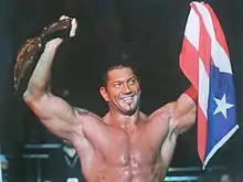On the June 23 episode of Raw, Batista was drafted from SmackDown to the Raw brand during the 2008 WWE Draft.[99] After failing to win the World Heavyweight Championship from Edge at Night of Champions, Batista attacked Edge the following night on Raw, allowing CM Punk to cash in his Money in the Bank contract on Edge. This set up a title match between Batista and Punk at The Great American Bash which ended in a double disqualification after Kane interfered and attacked both men. The following night on Raw, Batista and Punk had a rematch, Batista won by disqualification after he was attacked by JBL. As John Cena came to the ring to fight JBL, he inadvertently punched Batista as JBL ducked. This started a program between Cena and Batista leading up to SummerSlam, for which a match was made official by Raw general manager Mike Adamle. This was the first time a match between the two would occur as they had each been on separate brands since they both debuted in 2002. On the August 4 episode of Raw, Batista and Cena won the World Tag Team Championship from Cody Rhodes and Ted DiBiase, making Batista a three-time World Tag Team Champion.[100][101] The next week on Raw, Batista and Cena lost the World Tag Team Championship back to Rhodes and DiBiase.[102] After losing the titles, the two had to be separated by multiple officials. Batista defeated Cena at SummerSlam, legitimating injuring Cena's neck in the process.[103] Batista then competed in the World Heavyweight Championship championship scramble match at Unforgiven and was eight seconds away from being a four-time world champion, but Chris Jericho snuck in and pinned Kane in the waning seconds. On October 26 at Cyber Sunday, Batista defeated Jericho for his fourth World Heavyweight Championship in a match in which Stone Cold Steve Austin was voted in as the special guest referee.[104] Batista's reign, however, only lasted eight days when Jericho won the title back in a Steel Cage match on the 800th episode of Raw on November 3.[105]