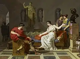 As related by Livy, in her meeting with Octavian, Cleopatra told him candidly, "I will not be led in a triumph" (Ancient Greek: οὐ θριαμβεύσομαι, romanized: ou thriambéusomai), but Octavian only gave the cryptic answer that her life would be spared.[47][48] He did not offer her any specific details about his plans for Egypt or her royal family.[49] After a spy informed Cleopatra that Octavian intended to bring her back to Rome to be paraded as a prisoner in his triumph, she avoided this humiliation by taking her own life.[31][50][51][note 5] Plutarch elaborates on how Cleopatra approached her suicide in an almost ritual process that involved bathing and then having a fine meal including figs brought to her in a basket.[52][53][54]