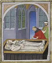 The story of Cleopatra's suicide by snakebite was often depicted in Medieval and Renaissance art. The artist known as the Boucicaut Master, in a 1409 AD miniature for an illuminated manuscript of Des cas de nobles hommes et femmes by the 14th-century AD poet Giovanni Boccaccio, depicted Cleopatra and Antony lying together in a Gothic-style tomb, with a snake near Cleopatra's chest and a bloody sword driven through Antony's chest.[122] Illustrated versions of Boccaccio's written works, including images of Cleopatra and Antony committing suicide, first appeared in France during the Quattrocento (i.e. 15th century AD), authored by Laurent de Premierfait.[124] Woodcut illustrations of Boccaccio's De Mulieribus Claris published at Ulm in 1479 and Augsburg in 1541 depict Cleopatra's discovery of Antony's body after his suicide by stabbing.[125]