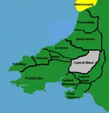 Deheubarth (Welsh pronunciation: [dɛˈhəɨbarθ]; lit.'Right-hand Part', thus 'the South')[4] was a regional name for the realms of south Wales, particularly as opposed to Gwynedd (Latin: Venedotia). It is now used as a shorthand for the various realms united under the House of Dinefwr, but that Deheubarth itself was not considered a proper kingdom on the model of Gwynedd, Powys, or Dyfed[5] is shown by its rendering in Latin as dextralis pars or as Britonnes dexterales ("the Southern Britons") and not as a named land.[6] In the oldest British writers, Deheubarth was used for all of modern Wales to distinguish it from Hen Ogledd (Y Gogledd), the northern lands whence Cunedda originated.[7]