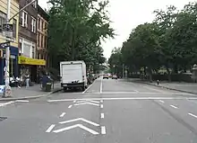 Between Woodward Avenue and Bushwick Avenue, DeKalb Avenue is a two-way, two-lane street; between Bushwick Avenue and Fulton Street, it is one-way westbound. (Lafayette Avenue is the corresponding parallel one-way street eastbound.)