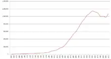 Birmingham city's total population was 977,099 in 2001. The 2005 estimate for the population of the district of Birmingham was 1,001,200. This is the first time the population has broken the 1,000,000 barrier since 1996.[7] This was a population increase of 0.9% (8,800) from 2004, higher than the 0.6% for the United Kingdom as a whole and 0.7% for England. It is believed to have been caused as a result of increased numbers of births, increased migration and a decrease in deaths in the district.[7] The population of Birmingham is predicted to increase, though it cannot be predicted at certainty due to fluctuations in previous years in migration. The population in Birmingham is predicted to increase by 12.2% (121,500) from 992,100 in 2003 to 1,113,600 in 2028. This is an increase of around 4,000 - 5,000 each year until 2028.[8]