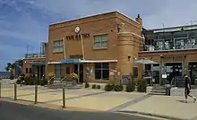 The noted bathing boxes in Brighton are known to have existed as far back as 1862, although the earliest ones were at the water's edge at the end of Bay St[8] rather than their present location on Dendy Street Beach just south of Middle Brighton.[9] In 1906, the completion of a tram line from St Kilda to Brighton led to an increase in applications for bathing box permits and significant construction between 1908 and 1911; final numbers are uncertain, but between 100 and 200 bathing box sites may have been allocated prior to the Great Depression.[8] As part of capital works programs during the Depression to help relieve unemployment, the City of Brighton, backed by State Government funding, relocated all bathing boxes to the high-water mark on Dendy Street Beach, or removed them completely. The boxes were relocated again in 1934 to their present position at the rear of this beach.[10]
