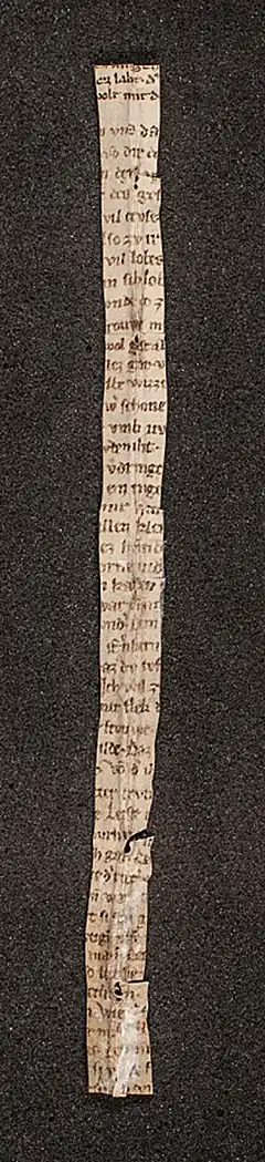 In July 2019, Christine Glaßner, from the Austrian Academy of Sciences (German: Österreichische Akademie der Wissenschaften) Institute of Medieval Research, while researching the archives of Melk Abbey, discovered a previously-unknown strip of parchment—measuring 22 centimetres (8.7 inches) by 1.5 centimetres (0.59 inches)—bearing 60 partial lines of the poem. The parchment had been subsequently recycled into the binding of a much later book, probably due to the rarity of the material.[44] It has been dated to around 1300, nearly 200 years earlier than previously thought. Only a few words were extant on each line. It was identified[44] and transcribed[24] by Nathanael Busch of the University of Siegen,[44] in collaboration with experts from the Academy and the Universities of Mainz and Marburg.[44] The scholar of gender studies, Emma L. E. Rees, commented how, in Der Rosendorn, as in other iterations of the motif, "again, it's a man who is responsible for reuniting a woman with her wayward, talking vagina".[45]