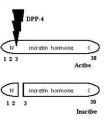 DPP-4 selectively cleaves two amino acids from peptides, such as GLP-1 and GIP, which have proline or alanine in the second position (Figure 2). At the active site where DPP-4 has its effect, there is a characteristic arrangement of three amino acids, Asp-His-Ser. Since alanine and proline are crucial for the biological activity of GPL-1 and GIP, they are inactivated by cleaving away these amino acids. Thus, preventing the degradation of the incretin hormones GLP-1 and GIP by inhibition of DPP-4 has potential as a therapeutic strategy in the treatment of type 2 diabetes.[1][8]