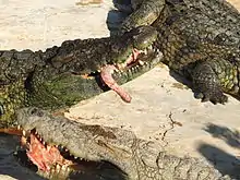 Larger fish, like catfish and freshwater bass, are preferred by adults more than 2.2 m (7 ft 3 in) in length. Particularly small fish are likely to be eaten only in case of sudden encounter, mostly in shallow, dry-season ponds where not much effort is needed to catch the small, agile prey.[13] Most observed fishing by crocodiles takes place in waters less than 1.5 m (4 ft 11 in) deep and fish are often caught when they swim into contact with the crocodile's head, even literally right into the reptile's mouth.[5] Across much of their range, they take any fish they encounter, but largish and relatively sluggish mesopredator fish such as lungfish and Barbus carp seem to be most widely reported. Many other genera are taken widely and relatively regularly, including Tilapia (which was the most significant prey genus in Lake Turkana), Clarias, Haplochromis, and Mormyrus.[4][5][14] In Uganda and Zambia, lungfish comprised nearly two-thirds of the piscivorian diet for crocodiles.[4] Similarly, in Lake Baringo, the lungfish is the crocodile's main prey and the crocodile is the lungfish's primary predator.[15] In the Okavango Delta, the African pikes (Hepsetus spp.) were the leading prey group for subadults, comprising more than a fourth of the diet.[16] Extremely large fish, such as Nile perch (Lates niloticus), goliath tigerfish (Hydrocynus goliath), and even sharks, are taken on occasion, in addition to big catfish, such as Bagrus spp. and Clarias gariepinus, which are preyed upon quite regularly in areas where they are common. In the Zambezi River and Lake St. Lucia, Nile crocodiles have been known to prey on bull sharks (Carcharhinus leucas) and sand tiger sharks (Carcharias taurus).[17][18][19] The largest fishes attacked in such cases may potentially weigh more than 45 kg (99 lb).[20][21]