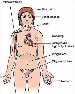 The signs and symptoms of Graves' disease virtually all result from the direct and indirect effects of hyperthyroidism, with main exceptions being Graves' ophthalmopathy, goiter, and pretibial myxedema (which are caused by the autoimmune processes of the disease). Symptoms of the resultant hyperthyroidism are mainly insomnia, hand tremor, hyperactivity, hair loss, excessive sweating, oligomenorrhea, itching, heat intolerance, weight loss despite increased appetite, diarrhea, frequent defecation, palpitations, periodic partial muscle weakness or paralysis in those especially of Asian descent,[7] and skin warmth and moistness.[8] Further signs that may be seen on physical examination are most commonly a diffusely enlarged (usually symmetric), nontender thyroid, lid lag, excessive lacrimation due to Graves' ophthalmopathy, arrhythmias of the heart, such as sinus tachycardia, atrial fibrillation, and premature ventricular contractions, and hypertension.[8][9]