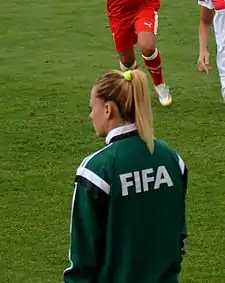 During her school years, she played volleyball. At the age of 17, she assisted with her sister their father in a football match as referee. And one year later, she assisted her later husband in a match.[3]