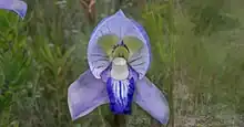 Plants are 200–250 mm (7.9–9.8 in) tall, growing from a tuber with a length of about 30 mm (1.2 in) and a diameter of about 10 mm (0.39 in). About 10 narrow, rigid leaves, about half as tall as the plant, grow from a basal rosette. The base of the plant is often surrounded by a sheath of old leaf fibers.[1] This species flowers in October and November, producing an inflorescence of 1-7 sweetly scented flowers. Each flower has a blue hood and side wings, with a dark purple lip below. Yellow-green petals are found at the back of the hood. [2] While the flowers look similar to those of Disa graminifolia, they differ in having an upcurved lip margin and a conical spur. They also flower at different times of the year. [3] While there is generally very little variation between plants, some white flowers have been observed. This has been suggested to be a recessive condition.[1]