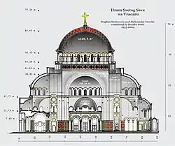 The word "cupola" is another word for "dome", and is usually used for a small dome upon a roof or turret.[9] "Cupola" has also been used to describe the inner side of a dome.[10][lower-alpha 28] The top of a dome is the "crown". The inner side of a dome is called the "intrados" and the outer side is called the "extrados".[11] As with arches, the "springing" of a dome is the base level from which the dome rises and the "haunch" is the part that lies roughly halfway between the base and the top.[11][12] Domes can be supported by an elliptical or circular wall called a "drum". If this structure extends to ground level, the round building may be called a "rotunda".[13] Drums are also called "tholobates" and may or may not contain windows. A "tambour" or "lantern" is the equivalent structure over a dome's oculus, supporting a cupola.[14]