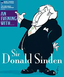 Sinden was a leading figure in the campaign to found the Theatre Museum in London's Covent Garden in the 1980s.[6] In 2007, Sinden embarked on a UK, European and American theatre tour to talk about his life, work and anecdotes in An Evening with... Sir Donald Sinden. Produced by his son Marc, this included, on 8 November 2007 as part of Marc's British Theatre Season, Monaco, a performance in front of Prince Albert of Monaco (the son of Grace Kelly, his co-star in the film Mogambo) at the Théâtre Princesse Grace, Monte Carlo.[18]