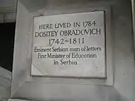 Dositej Obradović (Serbian Cyrillic: Доситеј Обрадовић, Serbian pronunciation: [dɔsǐtɛːj ɔbrǎːdɔʋitɕ]; 17 February 1739 – 7 April 1811) was a Serbian writer, biographer, diarist, philosopher, pedagogue, educational reformer, linguist, polyglot and the first minister of education of Serbia.[1] An influential protagonist of the Serbian national and cultural renaissance, he advocated Enlightenment and rationalist ideas, while remaining a Serbian patriot and an adherent of the Serbian Orthodox Church.