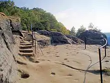 Drábské světničky is a ruin of a 13th-century rock castle in the Czech Republic. It is located about 4 kilometres (2.5 mi) northeast of Mnichovo Hradiště on the ragged edge of a sandstone cliff high above surrounding landscape. The castle covers a group of seven sandstone rocks, connected with wooden bridges. It has been abandoned since the Hussite wars in the 15th century.