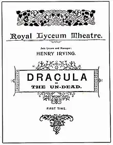 In 1924, the British producer Hamilton Deane premiered a stage version of Dracula at the Grand Theatre in Derby, England.[3] This version of the play was a modernized retelling of Stoker's story.[3] The play's success led to Deane taking it on tour for the next three years.[3] The play opened in London's Little Theatre on 14 February 1927, where it sold well while not being critically well received.[3] After seeing the play in London, American producer Horace Liveright bought the rights for Broadway, and hired John L. Balderston to Americanize Deane's text.[3][4] The Broadway version featured actors who would later be cast into the Universal film, including Bela Lugosi as Dracula, Edward Van Sloan as Prof. Van Helsing, Herbert Bunston as Dr. Seward.[5][3] Dracula opened at New York's Fulton Theatre on 5 October 1927, where it ran for 265 performances finally closing in May 1928.[3] Gary Don Rhodes described the play as "taking America by storm", a statement backed up by a 1930 article in the Chicago Tribune claiming that the play "has been rolling around the country ever since its first vogue two or three seasons ago, coaxing money into box offices that had abandoned hope of the drama, and of the shriek-and-shudder plays of the last five years it easily leads the list."[6][7]