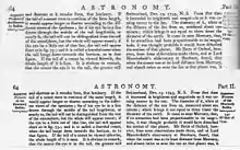 The first edition was reprinted in London, with slight variants on the title page and a different preface, by Edward and Charles Dilly in 1773 and by John Donaldson in 1775.[3] On the occasion of the 200th anniversary of the 1st edition, Encyclopædia Britannica Inc. published a facsimile of the 1st edition, even including "age spots" on the paper. This has been periodically reprinted and is still part of Britannica's product line.[7]
