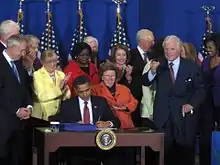 The Edward M. Kennedy Serve America Act or Serve America Act (H.R. 1388, Public Law 111-13) was introduced in the United States House of Representatives on March 9, 2009, by Representative Carolyn McCarthy of New York. Originally titled the Generations Invigorating Volunteerism and Education Act (GIVE Act), the bill reauthorizes and expands the AmeriCorps program that was first established in 1993. It passed in the House of Representatives on March 18, 2009.[1] The U.S. Senate debated and approved an amended version of the bill on March 26, 2009, renaming it the Edward M. Kennedy Serve America Act, after Senator Ted Kennedy. The House of Representatives voted on the bill a second time, approving the amended version on March 31, 2009.[2] It was signed by President Barack Obama on April 21, 2009.[3]