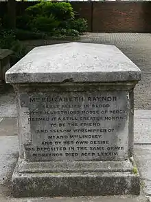 Mrs Rayner died at her home in Titchfield Street on 11 July 1800, aged 84. In her will, she asked for a simple burial, in a lead-lined coffin in "Mr Lindsay's vault", in Bunhill Fields. She made numerous bequests, including £2,000 in public stock to Dr Priestley, and a separate bequest for his son William.[3]