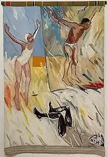 Amos moved to New York City after feeling stunted by the slow move of the Atlanta art scene. Amos was not expecting the level of racism, sexism, and ageism that she encountered upon moving to New York. Galleries would not accept her under the premise that she was too young to show, and studio teaching jobs rejected her on the grounds that, "We're not hiring right now".[9] Amos was told by both Cooper Union and the Art Students League that they were not hiring after she applied for a teaching position.[10] The difficulty of entering work into galleries led her to teach as an assistant at the Dalton School where she met artists and was introduced to the New York and East Hampton art scene, where she experienced difficulty showing her work in a "man's scene." It was also around this time that Emma Amos began her career as a textile designer, working for the weaver and colorist Dorothy Liebes, where her designs were translated into unique carpets.