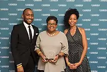 Joshua Allen and Attica Locke, writers and producers of the show Empire, stand with their 2015 Voice Award. They are joined by Sonay Washington Hoffman from Writers Guild of America, West.