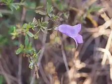 The flowers are usually borne singly in leaf axils on an S-shaped stalk, usually 10–20 mm (0.4–0.8 in) long. There are 5 overlapping, green, lance-shaped, sepals which are mostly 2.5–6.5 mm (0.1–0.3 in) long. The petals are 11–24 mm (0.4–0.9 in) long and are joined at their lower end to form a tube. The petal tube is deep lilac to purple on the outside and white with dark purple spots on the inside. The outside of the petal tube is hairy, but the inside surface of the lobes is glabrous while the inside of the tube is filled with woolly hairs. The 4 stamens are fully enclosed in the petal tube. Flowering occurs from March to October and the fruits which follow are oval to almost spherical, dry with a hairy, papery covering and are about 5–7 mm (0.2–0.3 in) long.[2][3]