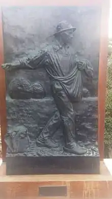 The monument aux morts at Commentry Commentry Allier This features a farmer, meditating whilst leaning on his scythe. Whilst working in a wheat field he has come across the grave of a soldier. The inscription reads- "La ville de Commentry à ses enfants victimes de la guerre" This monument is one of those grouped as "monument aux morts pacifistes". It is located in the rue Christophe Thivrier. There is another Desruelles work in Commentry. This is a bronze bust of Isidore Thivrier and marked the 50th anniversary of the founding of what was the world's first socialist municipality in June 1882 by Isidore's father, Christophe Thivrier.[2][3]