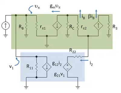For example, for a current-feedback amplifier, current from the output is sampled for feedback and combined with current at the input. Therefore, the feedback ideally is performed using an (output) current-controlled current source (CCCS), and its imperfect realization using a two-port network also must incorporate a CCCS, that is, the appropriate choice for feedback network is a g-parameter two-port. Here the two-port method used in most textbooks is presented,[31][32][33][34] using the circuit treated in the article on asymptotic gain model.