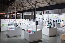 Among interactive stands there is a stand of the 3D cooperative sports video game Suunnistussimulaattori (lit. 'Orienteering Simulator'), where museum visitors could make a virtual trip to observe landscapes of Finland running with virtual orienteering map and compass.[11][12] This game has been used by Finnish and other orienteering athletes for virtual training (as an alternative to Catching Features), but development of this game stopped in 2016.[13][14][15][16][17] Also on the Suunnistussimulaattori stand behind the glass there are real orienteering sport equipment and game souvenirs, presented to museum by Antero Pulli, developer of the original game and Finnish orienteering athlete.[18][19]