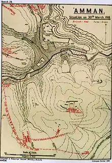 Chaytor's Force held a line from the railway near Quseir across the Ain es Sir track 2 km (1 mi) west of Amman to 2 km (1 mi) northwest of the city.[64] During the night the German and Ottoman line was strengthened and soon after daybreak on 28 March, German and Ottoman guns opened fired on the Anzac Mounted Division, whose only reply was the Imperial Camel Corps Brigade's four 12-pounder mountain guns of the Hong Kong and Singapore Mountain Battery. British reinforcements on their way from Es Salt, with two or three batteries of mountain guns began to arrive at 10:30 when the leading battalion was immediately put into a gap in the line, on the left of the Imperial Camel Corps Brigade, between them and the 2nd Light Horse Brigade.[29][30]
