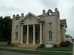 The First Presbyterian Church is a historic church at 200 North Second Street (corner of Second and Quay) in Dardanelle, Arkansas. It is a roughly rectangular masonry structure, built out of buff-colored brick and light stone trim. Its front facade consists of a pair of quoined and crenellated tower-like sections flanking a four-column pedimented gable portico, which shelters the entrance. Built in 1912–14, it is locally distinctive for its Classical Revival architecture, and for its Akron Plan interior.[2]