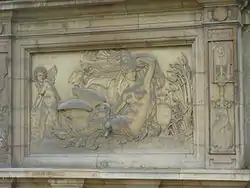 The fountain is composed of a bas-relief sculpture raised on a pedestal, between two pilasters with a pediment on top. An eagle, wings outspread and holding a crown of laurel, once decorated the pediment; it represented Napoleon's empire. The pilasters are decorated with sculptures of two intertwined dolphins: the one on the right around a ship's help, and the one on the left around a trident.