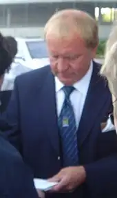 In 1994, Lee became chairman of Manchester City, ousting Peter Swales from the position by purchasing £3 million of shares at a price of £13.35 per share.[29] Lee was welcomed as a hero by City's supporters, who had formed a movement named Forward With Franny backing his attempt to gain control of the club.[30] Upon becoming chairman, Lee made a series of extravagant claims about his plans for the club, announcing that "This will be the happiest club in the land. The players will be the best paid and we'll drink plenty of champagne, celebrate and sing until we're hoarse".[30] In 1995, he appointed his friend Alan Ball as manager, but the appointment proved unsuccessful and the club were relegated.[31] Lee stepped down in 1998, with the club on the brink of relegation to the third tier of English football, a fate that Lee had dismissed at the previous annual general meeting by saying that he would "jump off the Kippax" if the club were relegated.[32] He was succeeded by David Bernstein. Lee retained a shareholding after leaving the board of directors but later sold all his shares to Thaksin Shinawatra in 2007.[33]