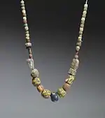 A 6th–7th century necklace of glass and ceramic beads with a central amethyst bead. Similar necklaces have been found in the graves of Frankish women in the Rhineland.