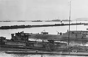 During World War I, Gustave Zédé sank in the Adriatic Sea on 24 August 1916 due to an explosion in her batteries, with the loss of four of her 40 crew. She was subsequently refloated, repaired, and returned to service.[1]