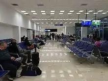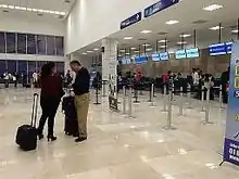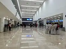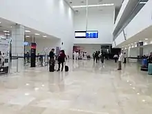 The passenger terminal is a two-story building. The ground floor houses the main entrance, a check-in area, and the arrivals section, which includes customs and immigration facilities along with four baggage claim carousels. Additionally, it offers car rental services, taxi stands, snack bars, and souvenir shops. The upper floor of the terminal contains the security checkpoint and departure area equipped with a food court, a duty-free shop, a VIP lounge, and Concourse A, featuring four gates equipped with jet bridges. This concourse is primarily utilized by Aeromexico, Viva Aerobus, and United Airlines. Concourse B (Gates B1-8) is situated on the ground floor's northern end of the terminal and is primarily used by Aerus, TAR, Viva Aerobus, and Volaris.
