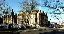 In the course of his career Dawson "erected several handsome blocks of buildings", which included the Britannia Buildings adjoining the Crown Estate, Prospect Crescent in James Street, Cambridge Crescent in Parliament Street, and "numerous others".[7][16][17] Some of those others are buildings in Parliament Street including Fattorini the Jeweller (1866–1868),[16][18][19] numbers 3–29 Swan Road (1881–1886),[16] and James Street including Ogden's jewellers,[11]:631,632[20] his residence Vanderbilt Court at 5 Victoria Avenue, 2–24 Crescent Road (Grosvenor Buildings), the wings of the Crown Hotel,[13] the block facing Victoria Park and Princes Square, and the block next to the Sulphur Well. He also built several villas in West End Park.[2][21] Some of these are now listed buildings, for example, 1–10 Prospect Crescent,[22] and 2–6 Crescent Road.[23]
